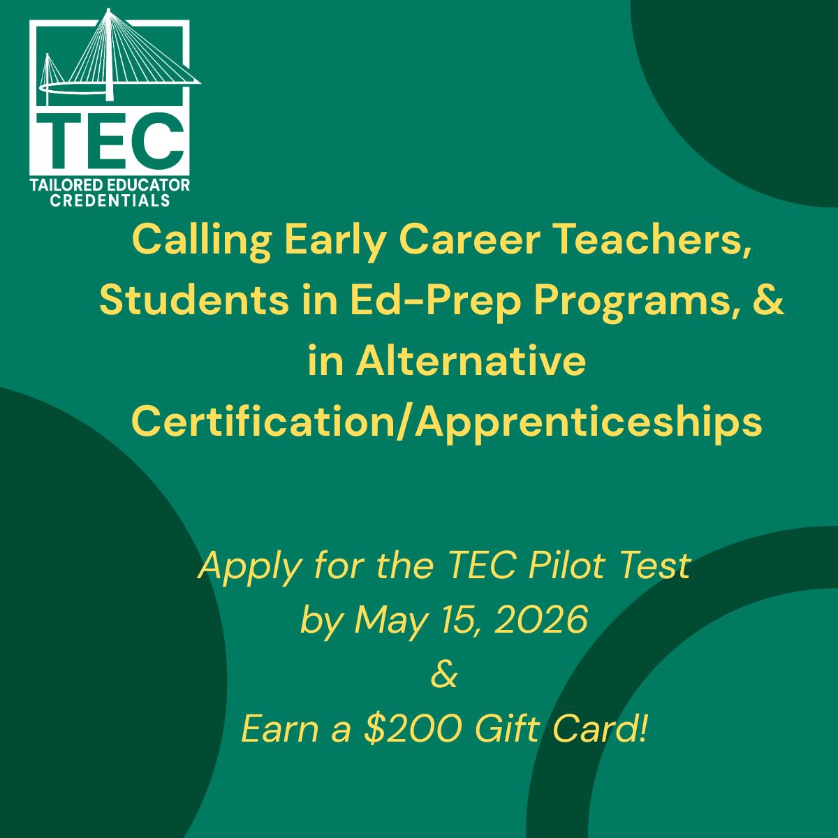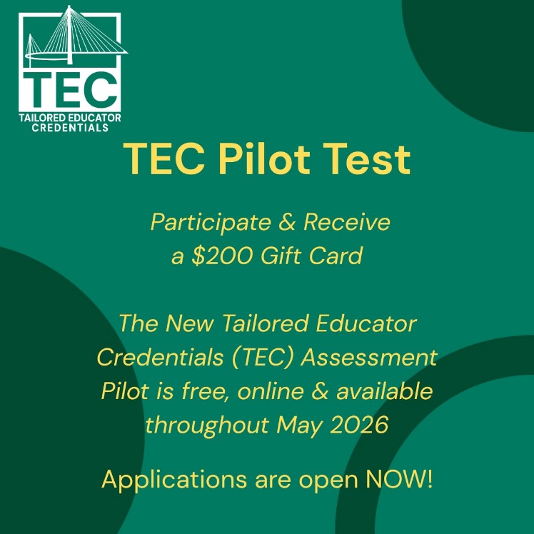 TEC-Elementary Education, TEC-Middle School Science, and TEC-Advanced Mathematics Pilot Tests are free of charge with selected participants receiving a $200 gift card upon completion.